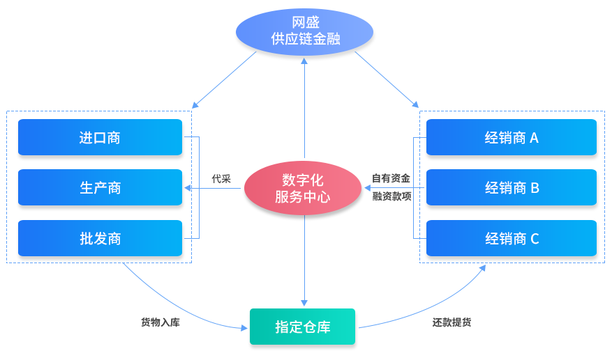对供应链单个企业或上下游多个企业提供全面交易、金融等服务。 网盛供应链金融是依托网盛数字化交易平台及供应链金融平台,为